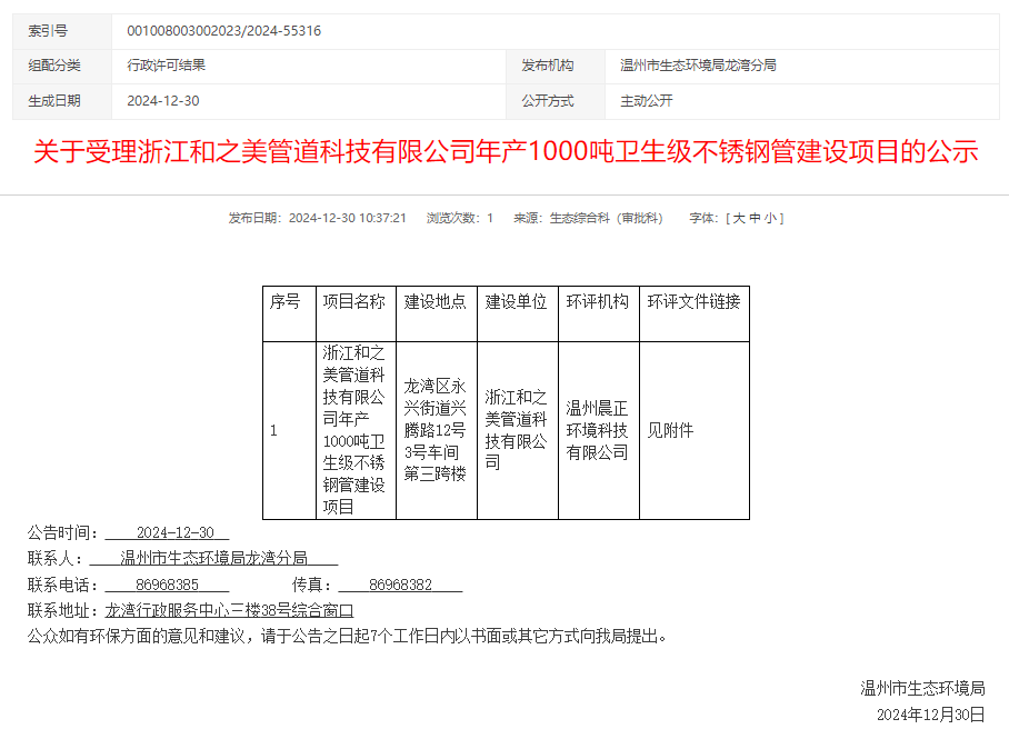 2024年12月30日溫州市生態(tài)環(huán)境局龍灣分局受理浙江和之美管道科技有限公司年產1000噸衛(wèi)生級不銹鋼管建設項目環(huán)境影響評價報告表并對外進行公示,公示期:7個工作日。