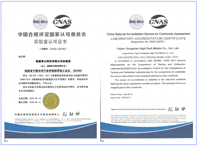 近日,福建青山特材有限公司實驗室經(jīng)過嚴格的評估和審核,成功獲得了中國合格評定國家認可委員會(CNAS)的認可,標(biāo)志著該實驗室在檢測和檢驗等領(lǐng)域的能力和技術(shù)水平已達到國際認可的標(biāo)準(zhǔn)。