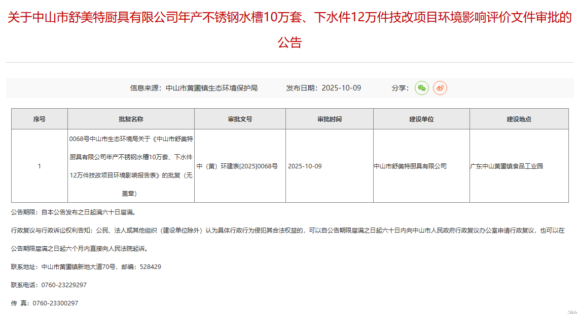 2025年10月9日,中山市黃圃鎮(zhèn)生態(tài)環(huán)境保護(hù)局就中山市舒美特廚具有限公司年產(chǎn)不銹鋼水槽10萬(wàn)套、下水件12萬(wàn)件技改項(xiàng)目環(huán)境影響評(píng)價(jià)文件作出審批意見(jiàn)并對(duì)外進(jìn)行公告,公告期限:自本公告發(fā)布之日起滿六十日屆滿。
